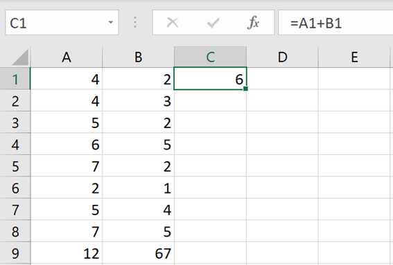 What you can see above is that when the formula is copied to each row, Excel keeps the column letters the same (so A and B) but changes the row numbers. So in the example above on row 9, it has copied the formula from cell C1 (which was "=A1+B1") and assumed you want to add up the values in row 9 and has made the formula ("=A9+B9").